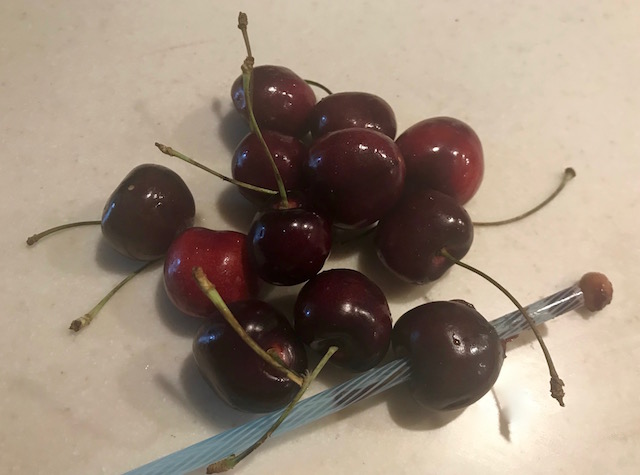 When cherries are ripe there is no time to lose. The window of opportunity lasts less than a week. The process of picking two to three pounds, culling, rinsing off debris and relieving them of their pits takes the better part of a morning. Every year I test several cherry pitters hoping one will magically prove to do the job quickly and cleanly. Yet again, this year I found impaling each cherry with a plastic straw was the most efficient but messy solution. Note: Eat as you work; there are fewer to pit.