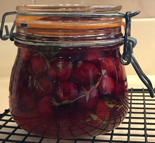 I chose to use recipes from contemporary sources for preparations of Pickled Cherries* and Spicy Cherries in Wine**. Both the pickle brine and sugar syrup for the sweet preserve are easy to assemble. The cherries will age in these solutions over a period of months in the refrigerator, although the cherry pickles are disappearing quickly. They make a great garnish with cheese and a piquant addition to summer salads. I will be guarding the spiced cherries for winter desserts.