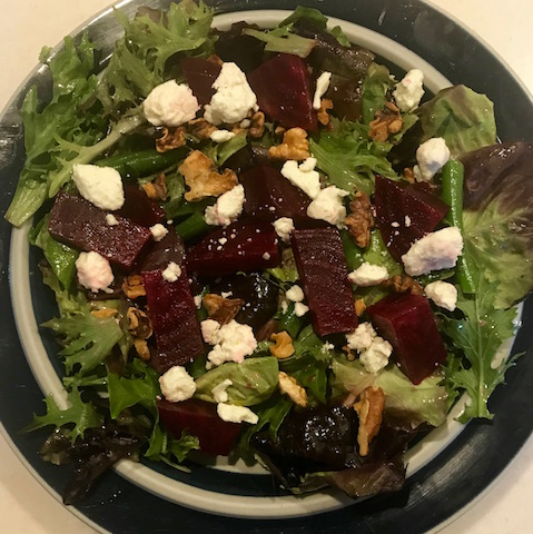 Salad of beets, green beans, goat cheese with walnut oil dressing