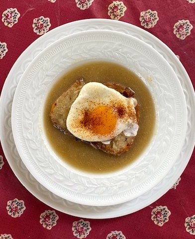 Place the toasted bread rounds in the bottom of each soup bowl and pour on the soup. Garnish with a poached egg and sprinkle on paprika. Serve hot with a chilled glass of fruity white wine.