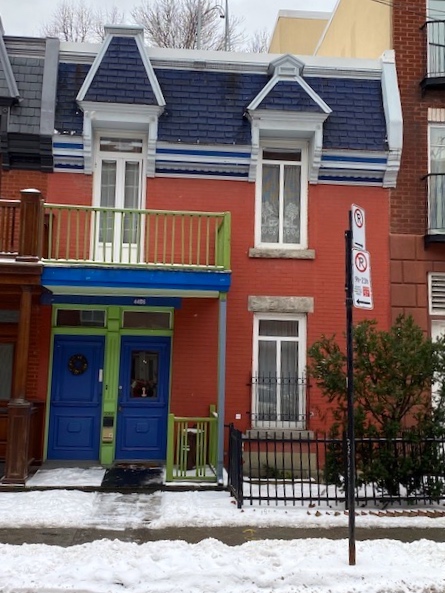 The well-groomed homes that line streets we walked in The Plateau neighborhood have enough visual details to engage a pedestrian navigating an icy sidewalks. Three-story houses are packed side-by-side and distinguished by an occasional architectural flourish or unusual color scheme that breaks up the uniformity. Each house may contain as many as five units determined by counting the number of doors that are accessible from ground level to a graceful outdoor metal stairway.