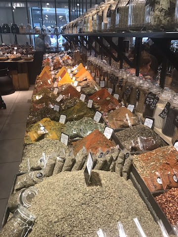 The launch this year of Galeries Lafayette Gourmet exemplifies an acceleration of gourmet retail in this city that is trying to recover its appeal after recent terrorist attacks.  The extensive project combines a spacious food hall, kiosks of famous specialty food brands and a complete grocery store covering two floors of its Boulevard Haussmann housewares store.  I sampled a luxurious truffle and artichoke salad with a glass of Sancerre at the Maison de la Truffe counter during my visit there in June.  My lunch cost 30€, less than half the price of a mid-day meal at its posh Place de la Madeleine location.  Perk alert: the people watching is terrific.