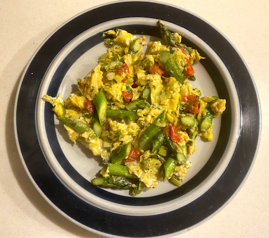 Optional Vegetables: Boil or steam the asparagus in advance.  Add cut pieces to the skillet just before the eggs, folding them in as they cook or pile the scrambled eggs over warm, whole cooked spears before serving.  Other delicious vegetable additions include peas, chopped broccoli or cauliflower.