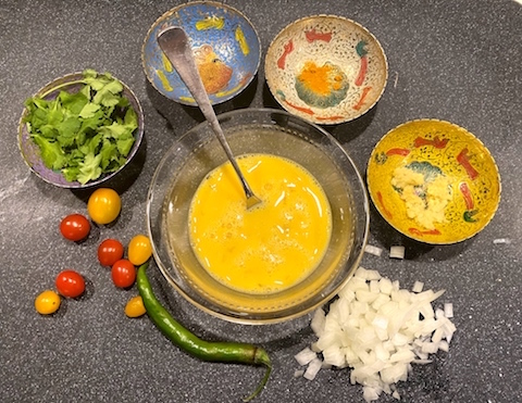 If you have eggs in the refrigerator, an onion of any kind, a few spices and six cherry tomatoes you can make what I think of as one of the 'real foods' of India.,  Parsi Scrambled Eggs is a staple dish on hotel breakfast buffets on India's west coast.  It checks all the boxes for our needs in quarantine conditions:  It is healthful, delicious any time of day, highly receptive to improvisation, and it’s easy to prepare.  The term Parsi is the name Indians gave to the followers of the Persian prophet Zoroaster in the 7th century when they  emigrated from what is now Iran to avoid persecution.  The Zoroastrian belief that the egg is a symbol of fertility and new life inspired a number of interesting egg dishes.  You may want to check them out.