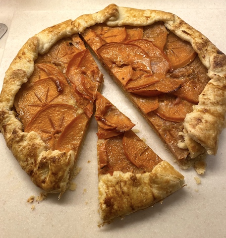 The fuyu persimmon looks so much like a small tomato that I find myself using it as if it were one in sandwiches with ham and cheese or simply grilled with brie. The fuyu also slips into the traditional role in a fruit in salad or featured in a dessert with a dollop of yogurt and a sprinkling of dried cranberries and pistachios. I have been hesitant to add persimmons to coffee cakes and jams for fear that its unique sweetness and soft texture will be lost in the process. That said, my one experience baking a Persimmon Membrillo Galette turned out to be very successful. The recipe features concentric rings of persimmon slices on a bed of membrillo (quince paste) curd baked in a buttery pastry shell. The persimmon slices roast to succulent perfection in the oven.
