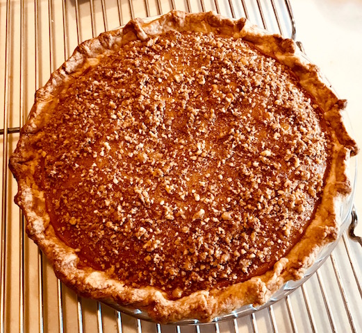 Here is the pie almost ready to bake. I wanted to show the generous coating of praline on the bottom of the unbaked pastry shell. The pie crust recipe is vintage Julia Child. I have mixed both butter and shortening into the flour for a tasty, easy to handle dough. (The glass pie plate was buttered in advance to avoid sticking.) After the puree of sweet potatoes, sugar, spices and eggs are smoothed over the praline, the pie will be ready for a 30 minute bake at 375 degrees. At that point I remove the pie and sprinkle on another generous layer of praline powder. The pie will bake at 350 degrees for another 30 minutes or until it is fully puffed and the crust is golden brown.