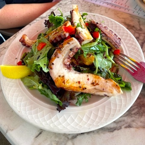 I'd forgotten how nice it is to serve yourself from a generous portion. It gives the diner a sense of familial participation. Too often restaurant food arrives posed and contrived. This fall I’ve been underwhelmed on occasion by meticulously arranged plates garnished with fruit. Two examples come to mind: octopus with melon and pickled cherries, also watermelon and radish slices with veal. I suppose I was primed to appreciate the skill and humility of the traditional cuisine at Les Papilles.