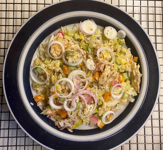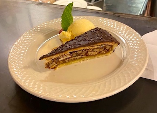 The main course of lamb shoulder with provencal vegetables was presented in a copper gratin dish still hot from the oven with a plate on the side. Once again, every aspect of the dish, from the tender meat, al dente vegetables and silken demi-glace was perfectly executed. The chef’s added garnish of cloves of garlic confit and a layer of sugar-snap peas and onion slices provided a bright, sweet accent without distracting from the traditional theme.. I could imagine the fanfare with which he stuck the sprig of fresh thyme into the meat just as it left the kitchen.