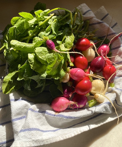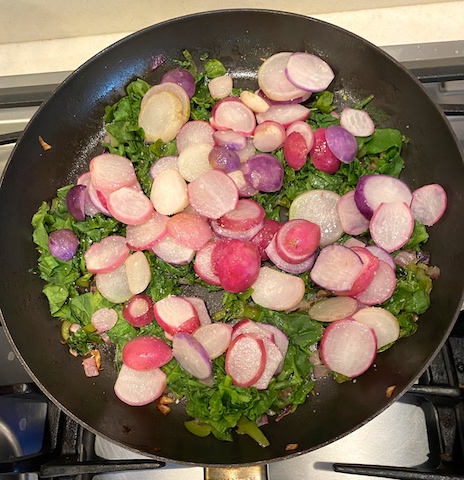 Gnocchi and gnudi are traditionally sauteed or baked in browned butter with fresh sage leaves. Sarah substituted horseradish leaves and tossed the gnudi into a pan with browned butternut squash and pecan halves. Once all the ingredients were hot and coated in butter, she squeezed on fresh lemon juice and scattered them over plates cover with salad greens. Think tart, tender pasta, sweet, buttery squash and roasted pecans with a touch of lemon to accent the flavors and fresh crisp greens.