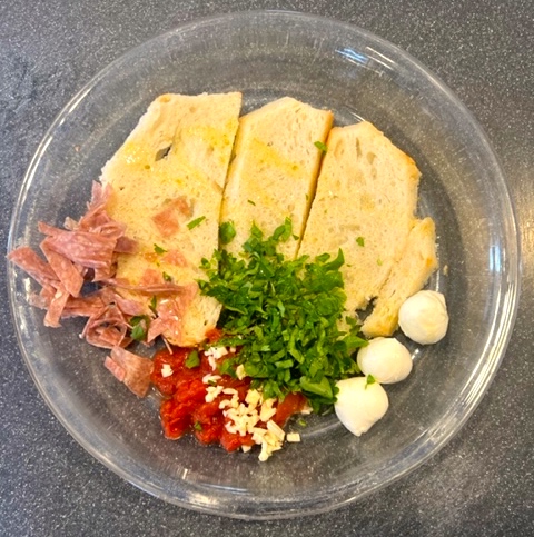 The height of transformative baking with stale bread is Bread Pizza, and it is quicker and cheaper than having one delivered . Simply gather leftovers from the refrigerator: cheese, lunch meat, cooked vegetables, some parsley. Chop them up and mix them with a couple slices of day-old bread, crusts removed, soaked in water and mashed with a fork into a puree. I like to add a tablespoon of olive oil and a clove of diced garlic. Squeeze out the water in your hands for a toasted consistency; leave it wet if you prefer a pudding-like texture. Bake it in a 500 degree oven for 10 -12 minutes. I guarantee you will experience a childlike sense of satisfaction with your accomplishment.