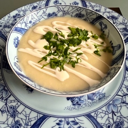 Possibly the oldest soup recipe was prepared by pouring hot broth over a thick slice of stale bread. If this sounds fanciful, try to imagine a French Onion Soup without the garlic-scented crouton and melted Gruyère cheese. Madeline Kamman’s 1976 classic, When French Women Cook introduced me to the elegant simplicity of Bread Soup. Her recipes combine bread soaked in milk with added broth and sauteed shallots. I have scaled back her addition of a copious amount of cream to one tablespoon of crème fraïche (or yogurt) drizzled over the surface. It’s a wonderfully comforting meal on a cold winter night.