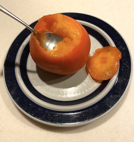 To this glowing fruit review, I add one caveat: do not snack on either persimmon if you have an empty stomach. An acid in the underripe hachiya persimmon's tannins can create a hairball in the human intestines. I have good news too! The acid that can causes this problem has been bred out of new persimmon varieties. I just found one called a Sharon Fruit at my local market this week.