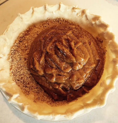 Here is the pie almost ready to bake. I wanted to show the generous coating of praline on the bottom of the unbaked pastry shell. The pie crust recipe is vintage Julia Child. I have mixed both butter and shortening into the flour for a tasty, easy to handle dough. (The glass pie plate was buttered in advance to avoid sticking.) After the puree of sweet potatoes, sugar, spices and eggs are smoothed over the praline, the pie will be ready for a 30 minute bake at 375 degrees. At that point I remove the pie and sprinkle on another generous layer of praline powder. The pie will bake at 350 degrees for another 30 minutes or until it is fully puffed and the crust is golden brown.