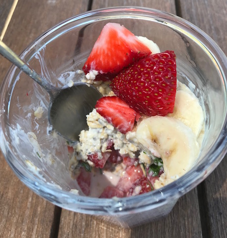 The next day I chose to sit on a shaded bench in the park to enjoy my chilled jar of overnight oats for lunch.  All the ingredients tasted as I predicted they would.  The oats were disappointingly thick, sticky and flavorless.  I wished I had added more honey and was grateful for the texture from the fruit.