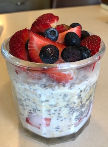 I was amazed to learn that oatmeal had escaped its morning niche to become a popular homemade carryout meal.  It consists of rolled oats mixed with a few chia seeds, layered in a Mason jar with fruit at the bottom and on top.  Milk of any variety is added to moisten the oats.  Yogurt and honey are recommended add-ins.